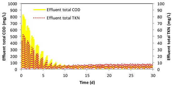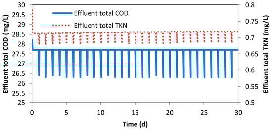 The PRWWTPs containing CAS + CAS and SBR + CAS processes were simulated through the GPS-X software under steady state conditions for 30 days and the final treated effluent investigated parameters such as TSS, BOD5, COD, and ammonia N from both PRWWTPs complied with the regulated treated effluent standards [41,42]. In addition, evolution of the main parameters of the final effluent during the 30 days of simulation for PRWWTPs containing CAS + CAS and SBR + CAS are demonstrated in Figure 3 and Figure 4, respectively. As shown, regarding the PRWWTP containing CAS + CAS processes, during the first day of the simulation, a decrease of the total COD and total TKN was noticed, since the system had not yet reached the steady state. For the PRWWTP containing SBR + CAS processes, from day 10 until the last day of the simulation, the parameters were approximately constant.