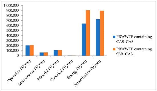 The total operation, maintenance, material, chemical, energy, and amortization costs ($/year) of the PRWWTPs containing CAS + CAS and SBR + CAS processes.