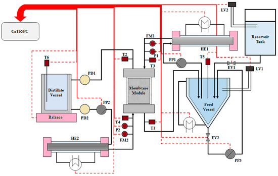 Figure 2 shows the direct contact membrane distillation (DCMD) equipment used in this work. Technical details are reported elsewhere [16]. The starting feed and condensing water volumes were 3 L each. The temperature of the feed and the distillate was 60 °C and 20 °C, respectively. Co-current solutions circulation flow rate was 12 L·h−1. Active membrane was 3.5 × 10−3 m2. Tests were performed with pure water or NaCl solution (1 g·L−1) as feed. Each test lasted 6 h.