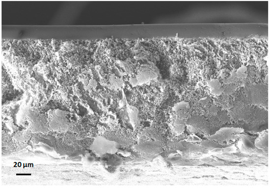 Figure 3 shows an SEM cross-section image of an SPE-MBA ionic liquid hydrogel composite membrane (IL 10 wt.%) prepared by casting the pre-polymerization solution at 100-µm thickness. It is evident the homogeneous hydrogel layer, typically around 20 ± 5 µm thick, was well linked to the PP support. For the same pre-polymerization solution composition, changing the casing thickness of solution layer (100, 350, or 600 µm) resulted in different width of the final hydrogel layer upon polymerization under UV irradiation. Normally, 350 and 600 µm-thick liquid layers load on the support lead to hydrogel layers of 80 ± 20 µm and 150 ± 30 µm, respectively, after polymerization. No significant effect of the amount of IL on the final hydrogel layer thickness was observed during membrane preparation (variation less than 10%). In the case of IL > 10 wt.%, pre-polymerization solution presented some persistent phase separation upon mixing of the components.