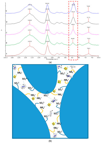 (a) ATR-FTIR spectra of ionic liquid hydrogel composite membranes (IL-HCMs) prepared with an increasing amount of IL (see Table 1): (A) SPE, (B) SPE-IL1%, (C) SPE-IL5%, (D) SPE-IL10%, (E) SPE-IL15%. (b) Schematic illustrating the effect of interaction between the fixed polyelectrolyte charges and mobile ionic liquid charges. White region denotes the hydrogel mesh structure with polymer chains and cross-linking points, blue spaces represent voids. The polymer mesh structure drawn here does not necessarily represent the effective system. The size of the ions relative to the mesh size is not drawn to scale.