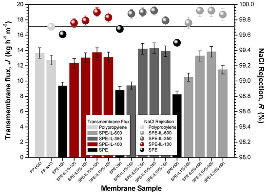 When including IL at 1 wt.% in the casting solution (SPE-IL1%-100), the transmembrane flux of the hydrogel-coated membrane is almost completely recovered (only 3% less) with respect to the PP, while it grows regularly up to 13.8 Kg·h−1·m−2 (i.e., larger than for the sole PP support) by increasing the amount of IL up to 10 wt.% (SPE-IL10%-100). In the latter case, rejection of NaCl reaches 99.99%.