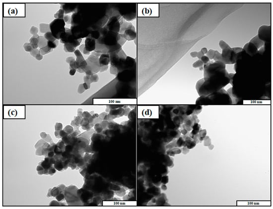 Transmission electron microscope (TEM) images of (a) TiO2, (b) Cu/TiO2, (c) Ag/TiO2, and (d) Cu0.9Ag/TiO2.