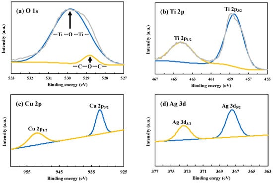As a result, the existence of Cu and Ag was confirmed in the samples, and all of elements including O, Ti, Cu, and Ag were observed. It clearly showed that Cu and Ag were successfully formed on TiO2. In addition to these results, XPS spectra of other TiO2 samples used in this study were shown in Figures S3–S6.