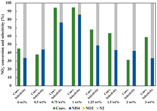 In addition to the optimization of the molar ratio, the loading amount of Cu0.9Ag on TiO2 was investigated (Figure 8). The NO3− conversion and the NH3 selectivity were improved as the loading amount of Cu0.9Ag increased. When the excess amount of the catalyst was used, the photocatalytic activity decreased. The highest NO3− conversion and the NH3 selectivity were given by 1 wt% of Cu0.9Ag doped on TiO2. Therefore, 1 wt% Cu0.9Ag/TiO2 was used as an optimum photocatalyst in this study.