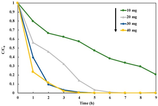After the optimization to the structure of the photocatalyst, we investigated the optimum dosage of the photocatalyst in the reduction of NO3− to NH3 over 1 wt% Cu0.9AgTiO2 (Figure 9). This experiment was performed in the presence of CH3OH under UV irradiation for nine hours, and the photocatalysts in the range of 10–40 mg were used. Loading 30 mg and 40 mg of the catalyst gave the significantly high NO3− reduction rate (Figure S7). Thus, we selected 30 mg as an optimum dosage of the photocatalyst in the NO3− reduction, because it can perform the reduction of NO3− with the lower catalyst amount. In this study, we fixed 30 mg of 1 wt% Cu0.9Ag/TiO2 as the optimal conditions for the reaction system.