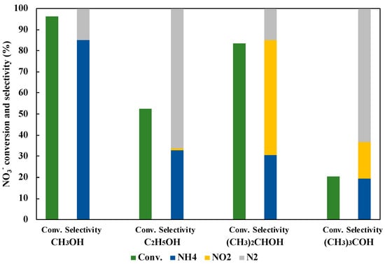 The hole scavenger was also the very important factor in the reaction with the photocatalyst. Figure 10 shows the effect of the hole scavenger on the reduction of NO3− to NH3. As a result, CH3OH indicated the most efficient NO3− conversion and the NH3 selectivity. In the photocatalytic NO3− reduction, CH3OH was turned to HCHO with h+, and then H2 was simultaneously released. Generated H2 on the photocatalyst surface was useful to reduce NO3− and NO2− (Equations (6)–(11)).