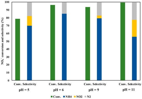We checked the pH effect in the solution during the NO3− reduction under UV irradiation for three hours (Figure 11). The initial pH value was about six without the pH adjustment. The NO3− conversion and the selectivity of NH3 decreased under pH = 5. This reason may be owing to it that the protons in the solution were not sufficiently reacted with NO3− adsorbed on the catalyst surface, as the protons repelled to the positive charges on the photocatalyst surface. Under alkaline conditions, the NO3− conversion was kept high, while the NH3 selectivity decreased compared with the case of pH = 6. There are two proposed reasons; i) some •OH radicals were generated in the solution, which promoted the oxidation of methanol. Hence, the reduction rate of NO3− was simultaneously enhanced and more NO2− ions and N2 products were generated; ii) the H+ concentration in the solution decreased under alkaline conditions, which leads to inhibit further reductions of NO2− to NH4+. On the other hand, the high NO3− conversion and the NH3 selectivity were achieved without the pH adjustment (pH = 6). This result may be shown that it was given by the sufficiently high H+ concentration and the good adsorption of NO3− on the catalyst surface under pH = 6.