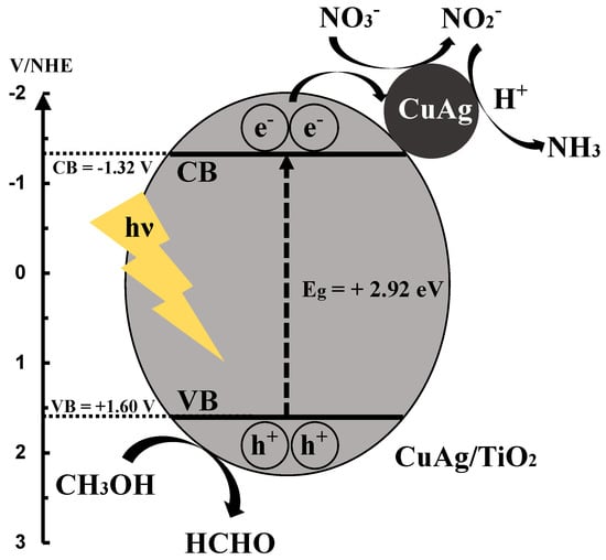 Firstly, the evaluation for the photocatalytic activity in the reduction of NO3− to NH3 was performed over TiO2 alone, Cu/TiO2, Ag/TiO2, and CuAg/TiO2 in the presence of CH3OH under UV irradiation for three hours (Figure 6). The amount of photocatalyst was 30 mg in all of test cases. In the photocatalytic NO3− reduction, NH4+, NO2−, and N2 seem to be mainly generated as the products. In addition, CH3OH was oxidized to HCHO by a photocatalytic reaction as a hole scavenger and the reduction produced hydrogen, which played an important role in NO3− reduction by following the equations: