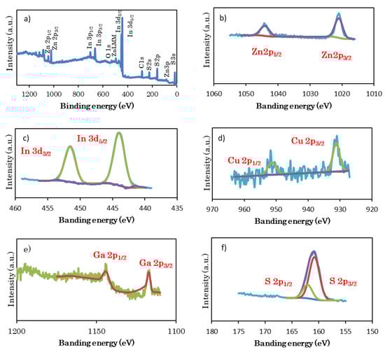 XPS narrow and survey spectra of Zn0.62(CuGa)0.19In2S4. (a) survey, (b) Zn, (c) In, (d) Cu, (e) Ga, and (f) S.