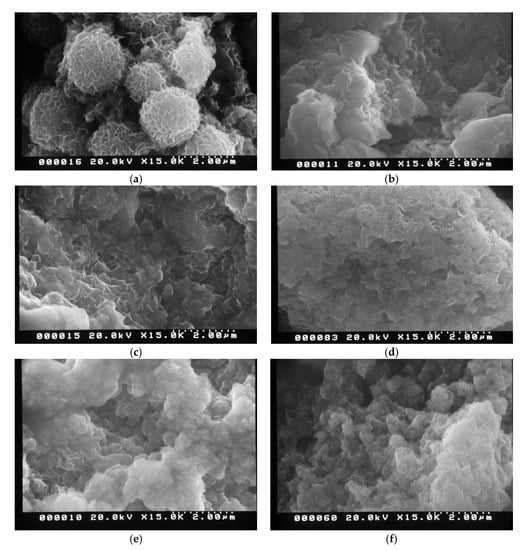 In order to investigate the influence of Cu and Ga doping on the characteristic surface morphology of Zn(1−2x)(CuGa)xIn2S4, SEM images of the prepared photocatalysts were observed. The results are shown in Figure 3. In pure ZnIn2S4, a microsphere-structure-like flower formed by overlapping of nanosheets was observed []. Co-doped with Ga and Cu, the spherical structure was destroyed, and the destruction was promoted as the doping amount increased. The nanosheet structure also collapsed and aggregated as the doping amount of Ga and Cu increased. The shapes of pure ZnIn2S4 and Zn0.62(CuGa)0.19In2S4 were very different. Cu+, Ga3+, and ZnIn2S4 are not composites; solid solutions may have been formed.