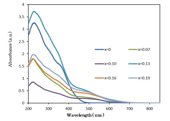 UV-visible spectra of Zn(1−2x)(CuGa)xIn2S4.