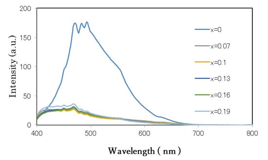 Photoluminescence spectra for Zn(1−2x)(CuGa)xIn2S4 excitation: 350 nm.