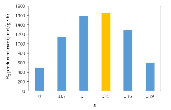 A hydrogen generation was conducted using the photocatalyst Zn(1−2x)(CuGa)xIn2S4. ZnIn2S4, Zn0.87Cu0.13In2S3.935, and Zn0.87Ga0.13In2S4.065 were used as comparative objects. All catalysts were loaded with 1 wt% Pt as a cocatalyst. The results are shown in Figure S5. The photocatalyst mono-doped with Ga or Cu showed higher hydrogen generation activity than pure ZnIn2S4. Furthermore, the photocatalyst co-doped with Cu and Ga showed the highest hydrogen generation activity. The optimum doping amounts of Cu and Ga were investigated, as shown in Figure 6.