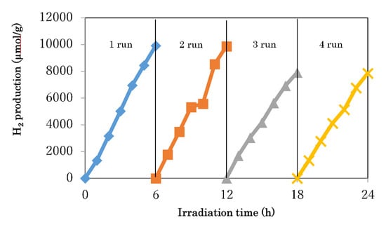 The hydrogen generation increased when the doping amount of Cu and Ga was from x = 0 to 0.13. The largest H2 production rate was obtained with Zn(1−2x)(CuGa)xIn2S4 (x = 0.13), and it was 3.3 times better than that of ZnIn2S4. However, the amount of hydrogen decreased from x = 0.16 to 0.19. The reason for the photocatalytic activity from increase to decrease may be due to the shielding by Cu and Ga. The dependence of photocatalytic H2 generation on doping levels has been reported by other studies [,]. In the stability test of the photocatalyst in Figure 7, The decrease in the amount of hydrogen production could not be observed in four cycles. A slight change in the amount of hydrogen produced in the 3rd and 4th cycles may have been due to the deterioration of the sacrificial agent. The TEM images before and after the hydrogen generation of Zn(1−2x)(CuGa)xIn2S4 photocatalyst are shown in the Figure S6. Only after hydrogen generation, a 3–4 nm spot was observed on the sample surface. The spot deposition was Pt, which was produced by the reduction during the hydrogen production.