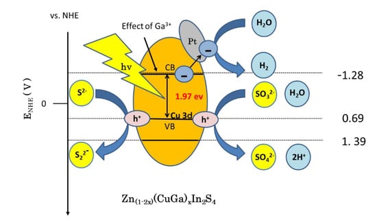 The reaction mechanism is shown in Scheme 1. Irradiation of light having a wavelength corresponding to the band gap energy of the Zn(1−2x)(CuGa)xIn2S4 photocatalyst excites electrons in the valence band of Zn(1−2x)(CuGa)xIn2S4 to the conduction band, in order to produce an electron hole pair (Equation (2)). The band gap in the case of Cu+ and Ga3+ co-doping was narrowed by forming impurity levels derived from the Cu 3d and Ga 4s orbitals on the negative side of the valence band and the positive side of the conduction band of ZnIn2S4, respectively. The tuned band gap promotes charge separation of the photocatalyst and improves the visible light response. In Equation (3), some of electrons excited in the conduction band of Zn(1−2x)(CuGa)xIn2S4 are consumed for the photodeposition of Pt. The hydrogen was produced from H2O and electrons which were transferred from conduction band of Zn(1−2x)(CuGa)xIn2S4 to Pt metal (Equation (4)). On the other hand, with regard to holes, sulfite ions and sulfide ions consume the holes and promote a hydrogen generation reaction. The presence of Na2S is very important for enhancing the photocatalytic activity; on the other hand, Na2S stabilizes the surface of the metal sulfide by suppressing the formation of surface defects as a scavenger of holes. However, when the concentration of Na2S is high, the pH becomes high. High pH values are thermodynamically disadvantageous in the reaction represented by Equation (4). As described in the Equations (5)–(7), SO32− and S2− consume holes, and promote hydrogen generation reaction. According to Equation (6), S22− ions are generated and act as an optical filter. If S22− is not consumed, it interferes with light absorption. As shown in Equation (8), the reaction between S22− and SO32− forms S2O32−, is colorless and does not compete with light absorption.