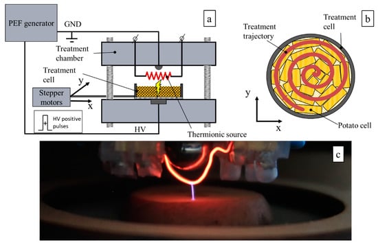 Experimental set-up used to provide nonthermal pulsed filamentary microplasma (NTPFM) treatment assisted by thermionic emission (TE) (a); schematic visualization of treatment trajectory in a treatment cell (not to scale) (b); and visualization of a NTPFM treatment process (c).