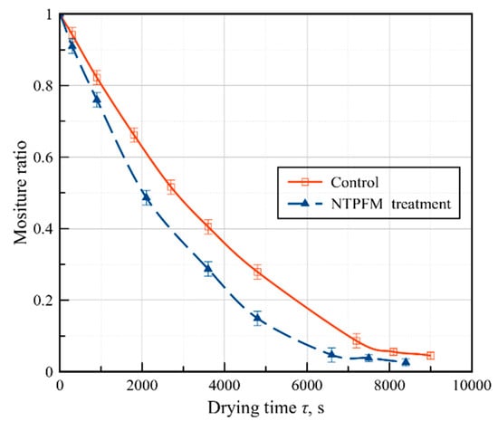 The moisture ratio ω versus drying time τ for intact (control) and NTPFM-treated samples.