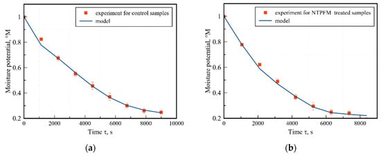 A comparison of the experimental drying curve with a model from Equation (24) for NTPFM-treated and control samples is shown on Figure 4. Competently settled mathematical model allows for the prediction of the progress of the process. It can also be a helpful instrument for food technologists in making in terms of the necessary drying time and process optimization.