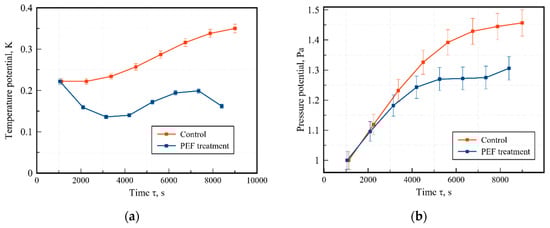 In our study, the mathematical modeling demonstrated that proposed model fit very well to the empirical data (discrepancy less than 3%). Kinetic coefficients from Equation (28) were used to find temperature and pressure potentials for NTPFM-treated and control samples. Figure 5a shows temperature potential curves for the potato sample. For the NTPFM-treated samples, a temperature drop at the initial time was observed (Figure 5a). This effect can be explained by cooling the sample surface with intracellular fluid, as explained in our previous work []. Turgor pressure reduction as a result of channel formation in the material by the NTPFM treatment affected the pressure potential curve. Thus, in samples previously treated by NTPFM, a lower pressure potential formed (Figure 5b).