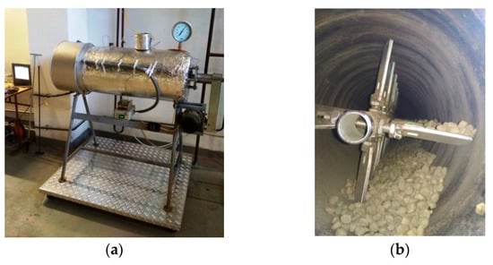 (a) Drum dryer with electric heating located on a tensometric scale; (b) Interior of the dryer with stirrer.