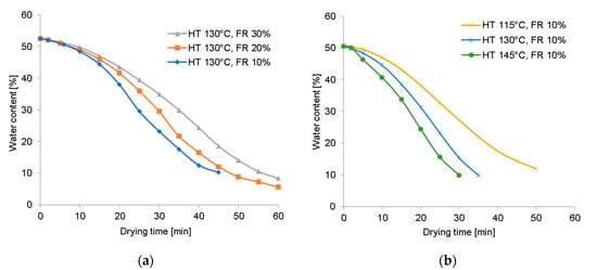 Drying curves: (a) For various filling ratios (FR); (b) For various heating temperatures (HT).