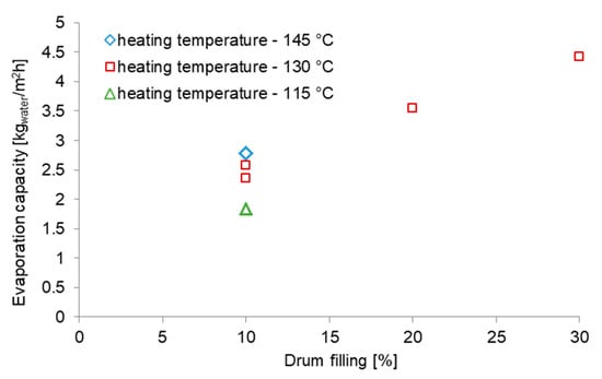 The evaporation capacities for both tested dryers evaluated from experiments with various dryer filling ratios are shown in Figure 8. Since the evaporation capacity is dependent on the actual water content, all the values are evaluated for drying between 30% and 50% of the material water content as the mean value for this interval, which is in respect to a stable state of the drying process (see Figure 7). The effect of the dryer filling ratio is shown for a heating temperature of approximately 135 °C.