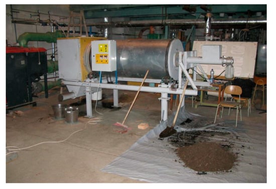 The indirect drum dryer in the laboratory scale (see Figure 1) was designed and built for a better understanding of the indirect drying process and for testing the drying of various materials under differing conditions. The dryer is electrically heated. The drum has an inner diameter of 0.256 m and a length of 1 m. It works in a batch mode. The dryer is equipped with a paddle-wheel agitator for material mixing to intensify the heat transfer process. The rotation velocity is 18 rpm. The inner lateral surface area of the drying drum is 0.81 m2 and the drum volume is 0.051 m3. In the course of the experiments, the dryer is closed and sealed to prevent air penetration with the aim of reducing the energy consumption of the drying process.