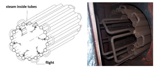 Based on experimentally determined drying characteristics and operational experience learned on the smaller scale, a prototype of a steam-heated rotary dryer (see Figure 5) was designed and manufactured. The configuration of the rotating drum is chosen due to the use of steam as a heating medium and for an improved distribution of heat from the heating surface of the material where the heat transfer takes place in the lower part of the drum where the dried material lies. The rotating drum consists of a series of tubes with condensing steam inside. The drying chamber has an inner diameter of 0.6 m and a length of 2 m. The drum has an adjustable revolution speed. On the inner side (the drying material side), heated flights (see Figure 6) are used to maintain a longer contact time with the heating surface and to increase the surface area of the dryer while maintaining its volume. The inner lateral surface area of the dryer is 6.42 m2 and the dryer volume is 0.59 m3. This drum also has an adjustable revolution speed. The dryer is heated by saturated steam from a steam network with regulated pressure rising up to 6 bars. The drying capacity is about 20 kg of evaporated water per hour. On the exterior, the drum is insulated with fiber insulation. Evaporated water is carried away out of the dryer by a header in the upper part of the dryer due to small overpressure in order of tens of Pa formed in the dryer as a result of developing steam during drying.