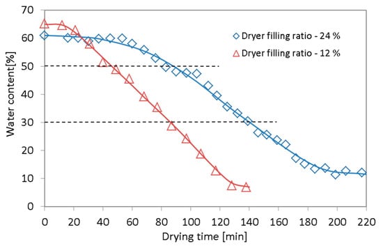 The value of the evaporation capacity increases with a higher filling of the dryer volume. A comparison of the drying curves of green wood chips for various dryer filling ratios is shown in Figure 7. The two dashes lines determine the interval of a stable state of the drying process with a stable value of the evaporation capacity.