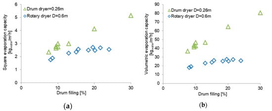 (a) Square evaporation capacity; (b) Volumetric evaporation capacity for drying between 50 and 30 wt % and a heating temperature of 135 °C.