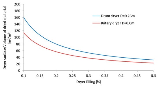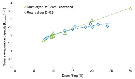 The results show that the evaporation capacities increase with a higher dryer filling ratio. If the dryer filling ratio is higher, it is necessary to evaporate more water from the material in relation to the surface of the dryer; therefore, a longer drying time is required (see Figure 3 and Figure 7). In addition, the relative size of dryer surface to the volume of the dried material reduces with the increasing diameter of the drum at the same relative filling ratio; see Figure 9.