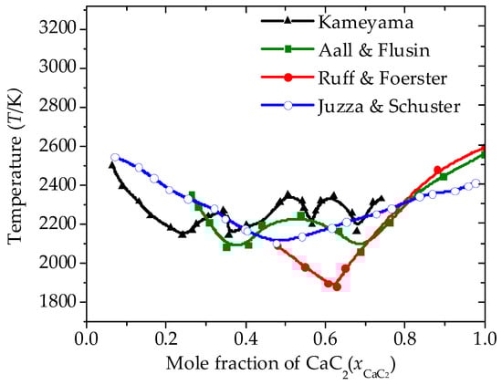 Stals [] measured and calculated the three-phase equilibrium in sulfur dioxide + p-toluidine binary. However, the CaC2-CaO liquid–solid phase heterogeneous reaction equilibrium system has not been studied extensively, mainly because the eutectic temperature of the CaC2-CaO binary system is extremely high and the melt cannot be easily observed. In 1923, Ruff and Foerster [] reported that the eutectic temperature of the CaC2-CaO binary system is 1910 K, and the mole fraction of CaC2 is 0.62. Flusin and Aall [] found that CaC2 and CaO could form a eutectic of CaC2·CaO at 2253 K. In this system, there are two eutectic points. One of them is at 2023 K when the mole fraction of CaC2 is 0.68, and the other is at 2073 K when the mole fraction of CaC2 is 0.356. Li [] measured the reaction activation energy of R2 by the so-conversional method and found that it was 213 kJ/mol when the temperature is higher than 1971 K but 477 kJ/mol when the temperature is below 1971 K. He attributed this relatively large difference to a predicted eutectic point of the CaC2-CaO mixture at 1971 K. Kameyama [] introduced the production of CaC2 from CaO and C and he proposed that, above 1200 K, the interdiffusion between CaO and C occurs to form the solid CaO·C and CaC2 gradually and that CaC2 and CaO could form four eutectics of CaC2·CaO between 2100–2200 K. Juzza and Schuster [] measured the liquid temperature of a CaC2 + CaO mixture system using optical pyrometry in 1961. They used CaC2 synthesized from metallic Ca and C in a Fe crucible. The reported impurities in the CaC2 were small amounts of CaO. The samples were not in contact with graphite during the experiments but were instead placed on titanium carbide to reduce the interaction of carbon with the sample. The time of the heating of the samples and the observation of the melting temperature were limited to reduce the possible evaporation of the sample. The reported phase diagram is for a simple eutectic binary system with a eutectic point at a CaC2 mole fraction of 0.48 and 2103 K. The results from all studies are summarized in Figure 1. Muller [] argued that the work of Juzza and Schuster is the most reliable of all of the studies cited, and, thus, most researchers used the data of Juzza and Schuster in subsequent studies.