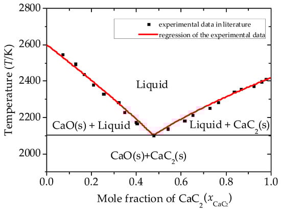 The phase diagram of the CaC2-CaO binary system is drawn in Figure 2 based on the data measured by Juza and Schuster. Then, Equations (6) and (7) were obtained using the solid–liquid two-phase equilibrium basic model [] to regress the experimental data: