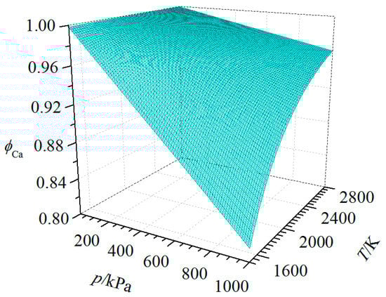 Figure 3 is clearly different from Figure 4 and Figure 5. In the range of 1500–2800 K and 10–1000 kPa, ϕi of Ca is below 1 and decreases with increasing temperature and decreasing pressure, whereas ϕi of CO and O2 are above 1, and they increase with increasing temperature and decreasing pressure. ϕi of Ca deviates further from 1 than ϕi of CO and O2, which means that temperature and pressure have greater effects on the non-ideal behavior of Ca than on CO and O2.