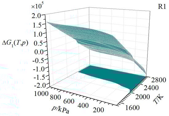 Figure 6 shows the relationship of the ΔG1(T,p) behavior surface of R1 with T and pCO. When ΔG1(T,p) = 0, the shadow on the T-pCO coordinate is a boundary line of the shadow part. The boundary line indicates that ΔG1(T,p) = 0 and that the required temperature of R1 gradually drops as pCO decreases within the range of 1500–2800 K and 10–1000 kPa. When pCO is 10 kPa, the temperature of ΔG1(T,p) = 0 is at a minimum value of 1950.0 K.