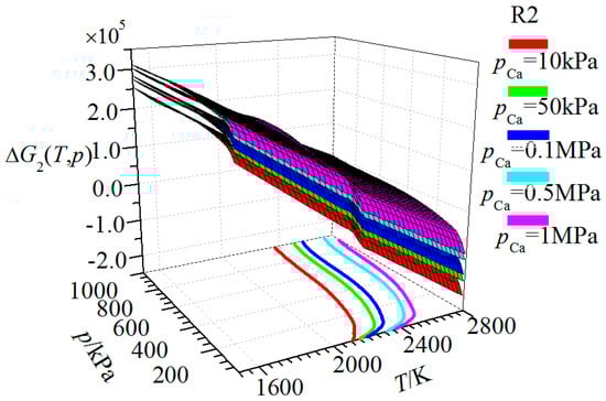 Figure 7 shows the relationship of the ΔG2(T,p) behavior surface of R2 with T and pCO. The curve lines on the T-pCO coordinate are the shadows of ΔG2(T,p) = 0 at different pCa values, which means that the equilibrium of the reaction shifts to the formation of products. When ΔG2(T,p) = 0, the temperature at which the equilibrium of R2 shifts towards the formation of products decreases as pCO and pCa decrease. When pCO and pCa are 10 kPa, the temperature of ΔG2(T,p) = 0 is at its lowest value of 2100.0 K.