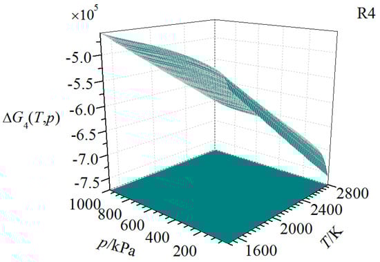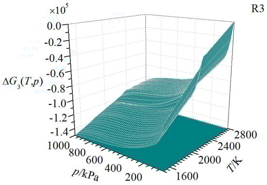 Figure 9 shows the relationship of the ΔG4(T,p) behavior surface of R4 with T and pCO. It indicates that the ΔG4(T,p) of R4 is always below 0; thus, in the condition range of 1500–2800 K and 0–1000 kPa, before reaching equilibrium, R4 shifts towards the formation of the products, i.e., C reacts with O2 to produce CO.