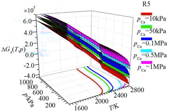 Figure 10 shows the relationship of the ΔG5(T,p) behavior surface of R5 with T and pCO. The curved lines on the T-pCO coordinates are the shadows of ΔG5(T,p) = 0, which means that the reaction starts to shift to the formation of products. When ΔG5(T,p) = 0, the temperature at which the equilibrium of R5 shifts towards the formation of products decreases as pCO and pCa decrease. When pCO and pCa are 10 kPa, the temperature of ΔG5(T,p) = 0 is at its lowest value of 2150.0 K.