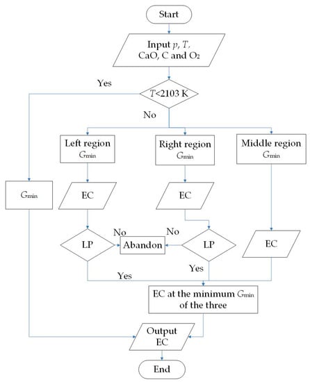 Figure 11 is the calculation flow diagram of equilibrium components of the system. In this diagram, the left region, right region and middle region represent the liquid + CaO (s) region, the liquid + CaC2 (s) region, and the liquid region in Figure 2, respectively. EC stands for equilibrium components and LP means lever principle. Gmin is the minimum Gibbs energy of the system at each condition.