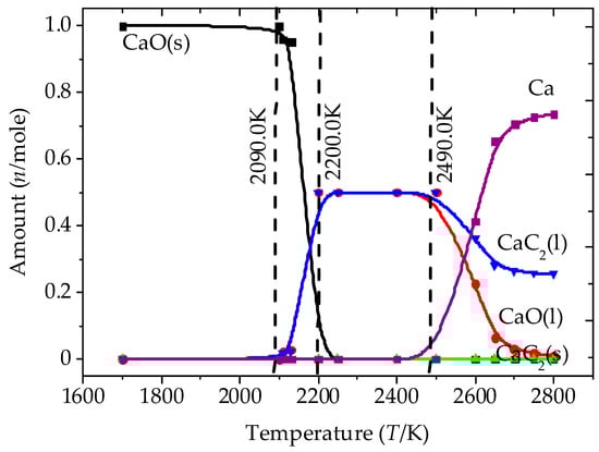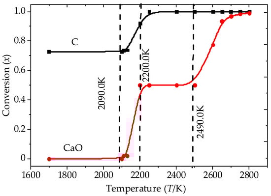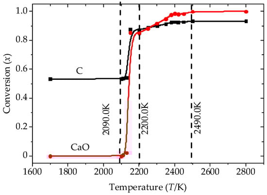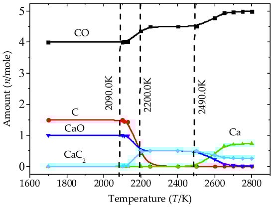 Figure 16 and Figure 17 show that, at approximately 2100 K, CaO starts to react with C to produce CaC2. CaO and C gradually decrease, whereas the conversion of CaO and C increases. CaC2 reaches a maximum at approximately 2200 K. After 2290 K, the C is completely consumed, but CO, CaC2 and CaO remain the same. After approximately 2490 K, CaO gradually diminishes, and Ca is rapidly produced. Then, the conversion of CaO is further enhanced to 100% at 2800 K.