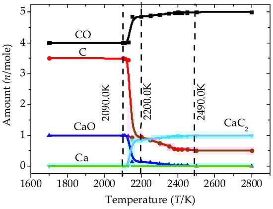 As discussed in Section 2, the amount of C present has an effect on the presence of Ca. When C is present in excess, the produced Ca can quickly react with C to form CaC2. Therefore, there is no Ca in the system when the system reaches equilibrium. In contrast, Ca will persist in the system when C is limited, so there is Ca when the system reaches equilibrium. Therefore, the amount of C in the system should be considered when studying the equilibrium composition. After energy coupling calculation, the appropriate initial amounts of CaO, O2 and C are 1, 2.5 and 7.5 mol, respectively. Based on this theory, different equilibrium compositions are obtained under excessive C and limited C conditions.