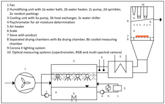 The drying experiments were conducted in a single layer through-flow dryer, whose function is shown in Figure 1, and a Binder KBF 720 (Binder GmbH, Tuttlingen, Germany) drying chamber. Preliminary experiments guaranteed that the products from both dryers had the same drying kinetics. During those tests, changes in product mass, moisture content and surface temperature as well as the total drying times and final moisture content of the products were analyzed [14]. Therefore, samples with the same moisture content xwb could be compared despite being dried in different dryers. The samples of the single layer dryer were used for analysis of the spectra and the relative moisture content xwb, whereas the samples from the drying chamber were used for analysis of the relative moisture content xwb, total soluble solids (TSS) and pH-value.