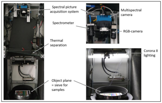 In industrial applications, multispectral or hyperspectral analysis systems are often used for sorting tasks where it is decided whether a product is “good” or “bad”. For example, nuts and their shells can be separated or those analysis systems can be used in grain handling to distinguish between grain and impurities [21,22]. These are classification problems, and the products examined are divided into classes. The combination with PLS and PCA/PCR, however, can also be used for regression tasks. This means that the data collected can be used to draw conclusions about the unambiguous state of the product at any time and not just about its category, which allows a much more detailed interpretation of the collected data.