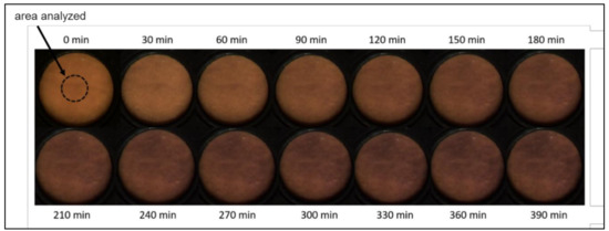 In a set of preliminary experiments, the quality of the new multi-spectral imaging system in drying processes was analyzed. The general set-up is described in the chapter “Dryer and Drying Process”; more detailed information is given in Figure 2. Reference measurements were acquired with the spectroradiometer (OceanOptics USB 2000+ with a 600 µm glass fiber OceanOptics QP600-2-UV and a 50 mm lens by Ocean Optics, Ostfildern, Germany) and compared with estimated spectral reflectance measurements obtained from the 3-channel RGB CMOS camera (IDS uEye CP GV-5260 CP by IDS, Obersulm, Deutschland) as well as the 12-channel multi-spectral imaging system. For the spectroradiometric measurements, the measurement spot is in the center of the sample and has a diameter of approximately 10 mm (also shown in Figure 3: dotted circle in picture 0 min). The wavelengths of the multi-spectral imaging system that are analyzed in this work lie between 380 nm and 730 nm. The field-of-view of the camera covers a larger area of 220 mm by 220 mm. For the spectral measurements derived from the multi-spectral image, the measurement spot was selected from the images to correspond to the spectroradiometer.