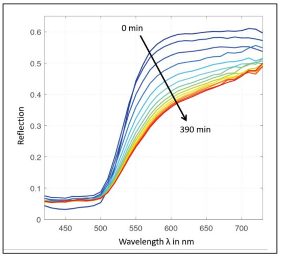 Figure 3 shows the RGB pictures of mangoes and their changes over time (0 min up to 390 min) from the preliminary experiments for reference. It can be seen that the color changes slightly but uniformly over the drying time. This behavior can also be found in the changes in the calculated spectral reflectance (Figure 4).