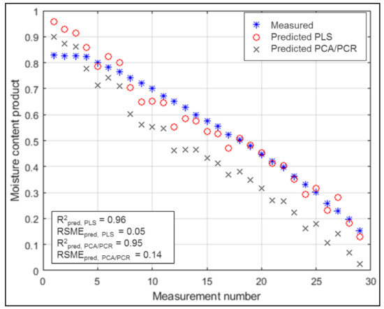 The data of the multi-spectral imaging system were then used to investigate if a prediction of the samples’ quality criteria based on the spectral information was possible. When using PLS and PCA/PCR highest R2pred were obtained when predicting the relative moisture content xwb of the samples. As can be seen from the data in Table 2 and Figure 5, the measured and the predicted results have a low RSMEpred and high R2pred of the prediction of the test data.
