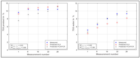 TSS measured and predicted for product (left) and water (right) (PLS and PCA/PCR).