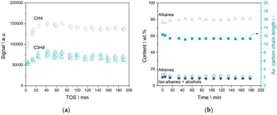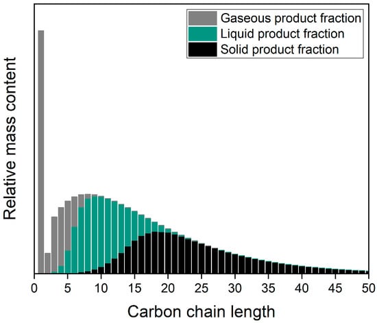This synthesis is influenced by a myriad of different process parameters such as the catalyst and support system, temperature, partial pressures, residence time and overall feed gas composition and dilution, as well as conversion levels [4,5,6,7]. All of those characteristics have been intensively investigated in the history of the FTS [2,6,8,9]. Investigations regarding process properties for the cobalt-based catalyst used in this work have been executed before [10,11,12,13,14,15]. Figure 1 shows a typical carbon chain length distribution of the FTS products. They mainly consist of linear alkanes, alkenes and iso-alkanes, as well as alcohols [2,16,17,18,19].