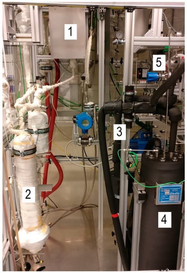 Figure 4. Photograph of the test rig used in this work. It contains the reactor in its insulation box (1), the HT (2), µHE (3), CT (4), and the back-pressure regulator (5).